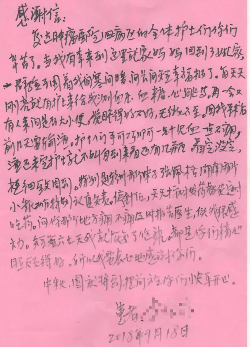 19 сентября 2018 года тётя Ли, страдающая аденокарциномой легкого, написала благодарное письмо в Онкологическую больницу Фуда при Университете Цзинань, чтобы благодарить доктора Ню Больницы Фуда и всего медицинского персонала.