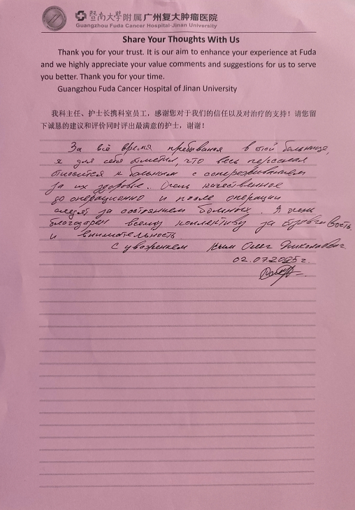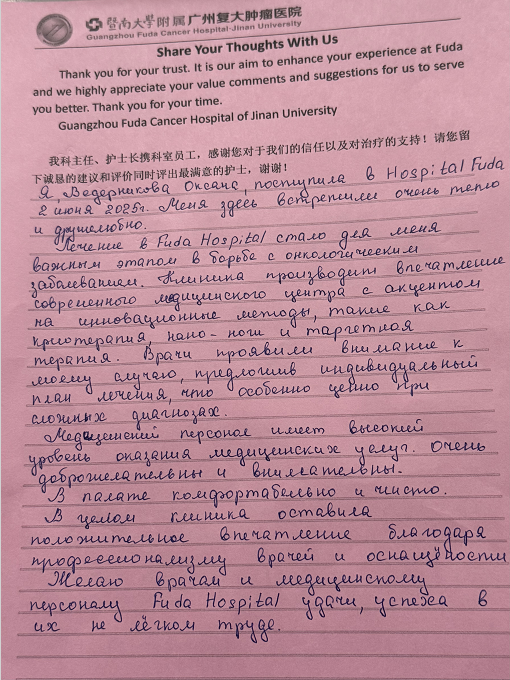 Как международная онкологическая больница, уникальная антираковая концепция ФУДА (позволяющая обеспечить долгосрочное выживание больных раком высокого качества) и новейшая международная минимально инвазивная терапия (такая как нано-нож, аргон-гелиевый криостат и имплантация частиц йода и т. д. ), лечение больных раком из более чем 100 стран мира.
