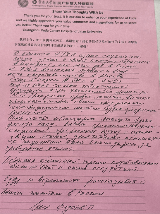Представительство онкологической больницы «Фуда» в г. Москва предоставляет бесплатные консультационные услуги (адрес самой клиники: Китай, г. Гуанчжоу).За более чем 20 лет с момента основания больницы десятки тысяч иностранных пациентов обратились к нам в поиске новых методов лечения.